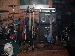 BASS GEAR - VARIES FROM ONE NIGHT TO THE NEXT. BASICALLY 4X10 CABINET, VINTAGE PEAVEY HEAD, IBANEZ AND VARIOUS BASSES